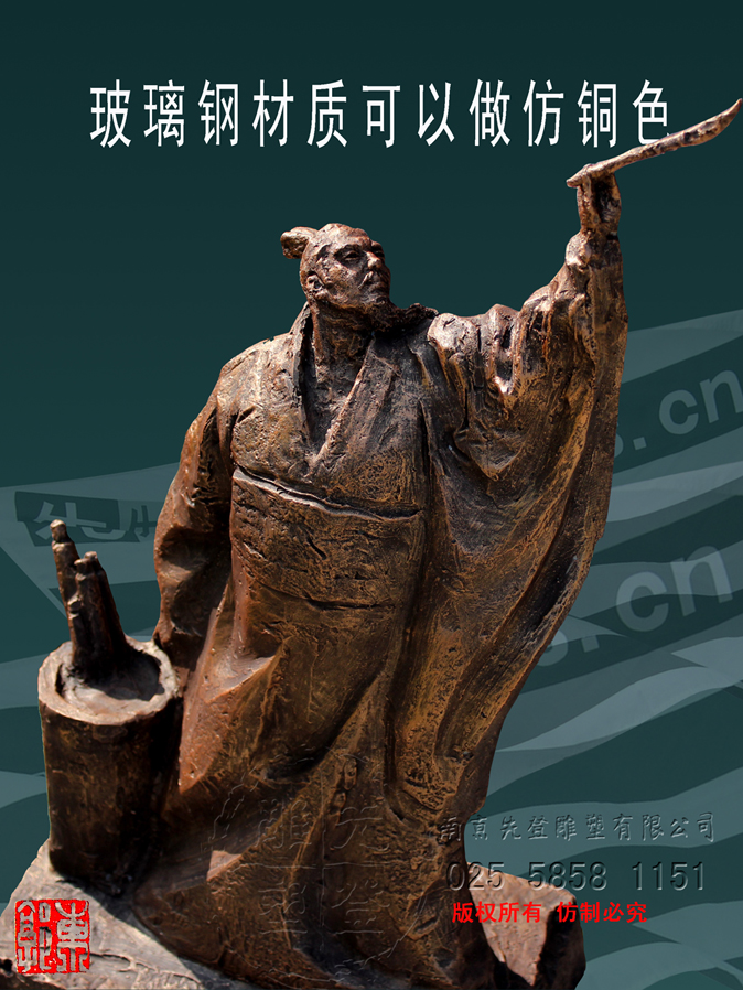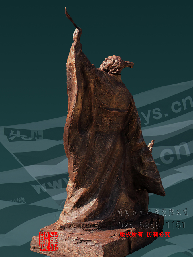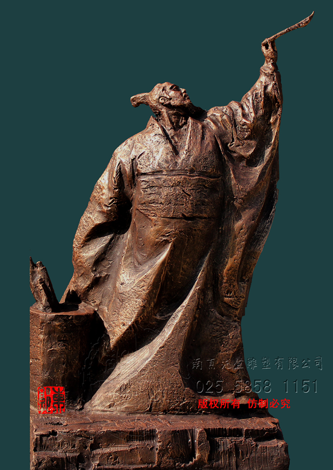 張芝字伯英,出生官宦之家,幼時高操,勤習(xí)學(xué)書,朝廷賞識,令他做官,而他并非貪圖高官厚祿,甘做布衣。素日臨池學(xué)書,得崔杜之法,復(fù)而變之,遂成“今草”。張芝對書藝癡醉令人驚嘆。衛(wèi)恒《四體書勢》里有言“凡家之衣帛,必先書而后練之。臨池學(xué)書,池水盡墨。”張芝對于書法藝術(shù)的不斷索求,終成一代“草圣”,當(dāng)是“為世所寶,寸紙不遺”。雕塑里張芝如平日習(xí)作,但見他揚手,握管,在虛空中縱姿揮毫,一如其書法,一筆而就,不拖沓凝滯,衣袍素袖宛如字之體勢婉轉(zhuǎn)流暢,舒箋觀鳥跡,研墨染魚緇。